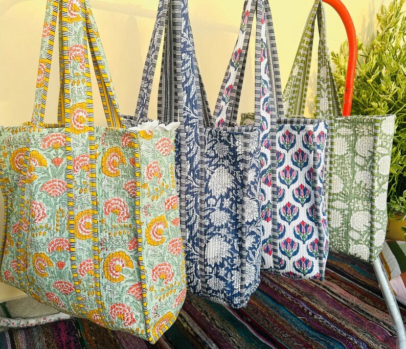 The Indian Handmade Block Printed Cotton Quilted Women's Handbags from Rajasthan India. This handbag is completely Indian printed on good quality cotton.